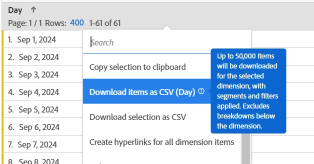 Yes, you can actually download up to 50,000 rows of data by right clicking on the dimension, and selecting "Download items as CSV"