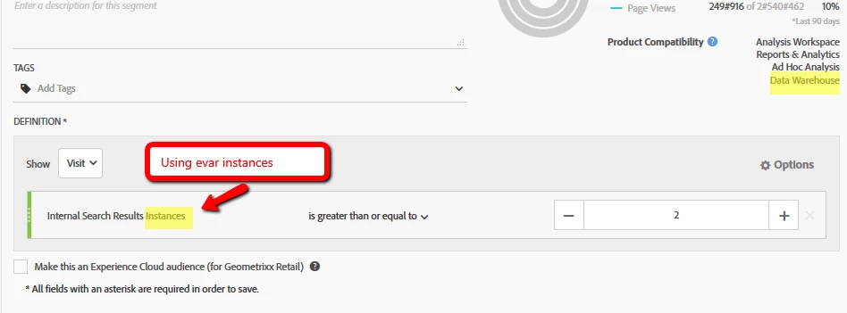 I would need a segment which for examples says something like evavr search type instance equals or greater than 2 but both must also be search type a, because if I would use it like this it would also count for search type b.