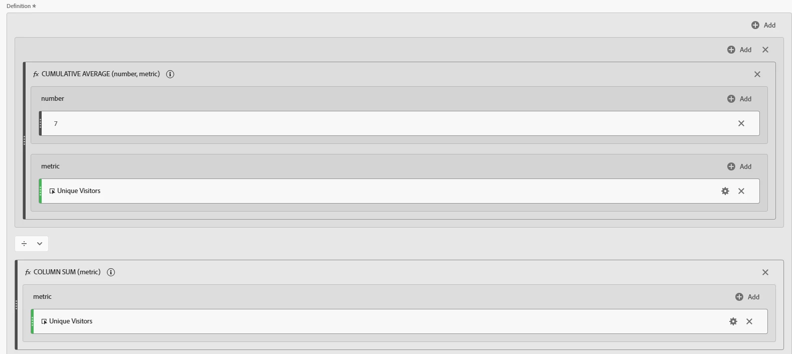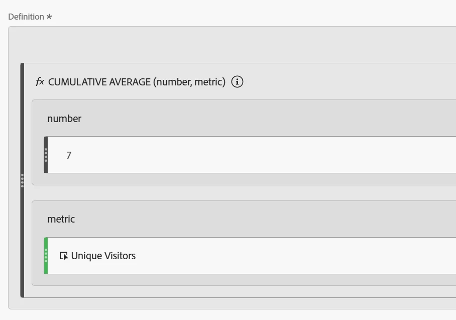 The cumulative average calculates an average value for whatever metric you select for the last X number of rows. In the screenshot below, this is how to build it. Under number you would put 7, because you want a rolling 7 day average. This means that for each row, it is going to calculate the average of the last 7 rows. Then you put in the metric that you want to average, in this case you mentioned unique visitors.