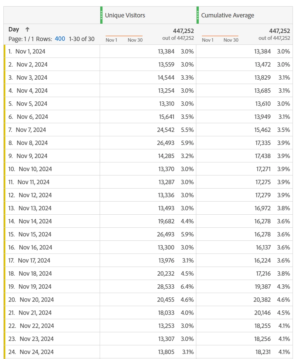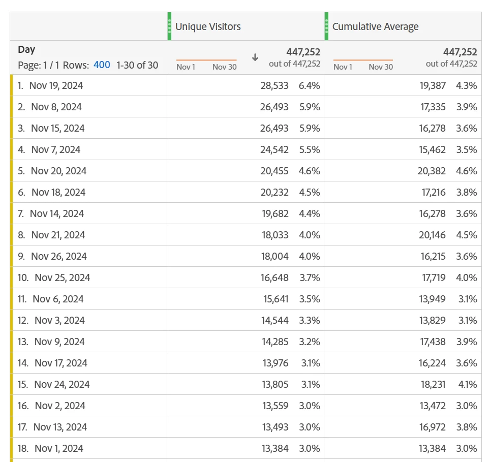 The cool thing about cumulative averages is that it works based on the time dimension (in this case, days). It depends on the value in the dimension, not the order of it. What that means is that you can have the days in order like in the screenshot above, or you can sort by another column, having the days not in order. It will still calculate properly. If you look at the screenshot below, you can see Nov 1 is now on row 18, but it is still only calculating the average based on the single day. If you look at the values in the screenshot above and below, you will find all of the days still match up in terms of values.