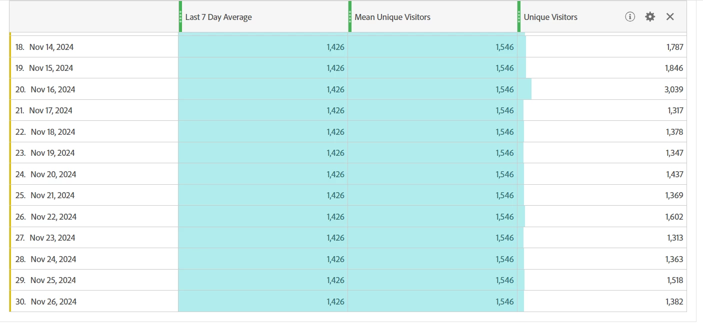Once you put that in your table, put it against the dimension day. This way it uses the days to calculate the average. The table below is demo data, but it should still give you a good idea of how this works. For my date range I just did November 2024. So the first row, Nov 1, the average is the same as the unique visitors because there is only 1 row. Nov 2 it takes the average of Nov 1 and Nov 2. And so on. By the time we get to Nov 7, it now has 7 rows of data to average. So Nov 7, and every row after that will be the average of the last 7 days (the current row + the 6 previous ones).