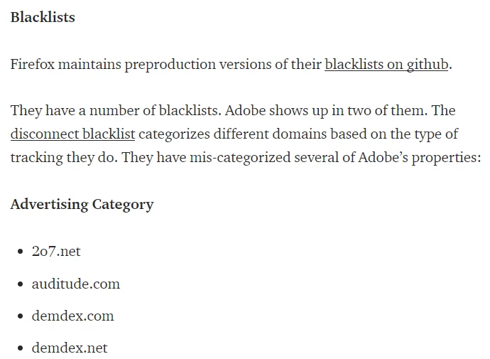 - Article where demdex.com is mentioned as having cookies explicitly blocked by Firefox: https://medium.com/adobetech/a-review-of-browser-privacy-initiatives-and-proposals-4ae86edc23c