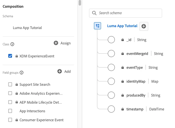 To leverage Experience Events, create an XDM schema choosing the Experience Event class. This will automatically enable key fields, including _id and timestamp, which are required fields and collected automatically, as well as other fields important to your events, such as eventType and identityMap.