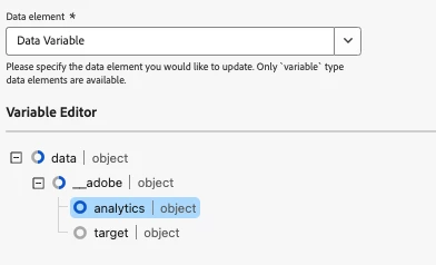 Once the data element is ready, populate the object in your rules using the “Update variable” action type in the Web SDK extension. Add your variable data element and begin mapping.
