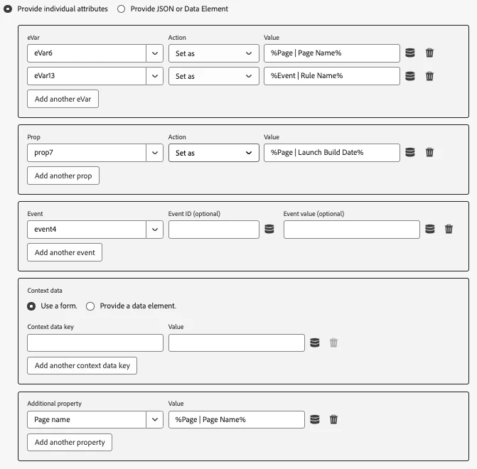 Map your eVars and props to data elements, set events, and pass context data and additional properties.