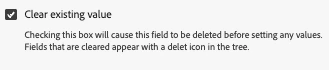 Don’t forget to check the “Clear existing value” box if you need to clear the data object before setting values. For example, if you set values in the data object in a page view rule, you may want to clear those variables before sending subsequent link clicks on the same page. This works as if you used the "Clear Variables" action before "Set Variables" action with AppMeasurement.