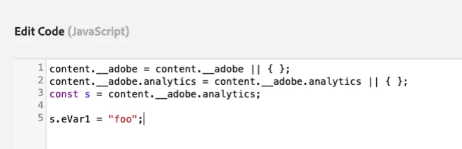 The custom code editor in the "Update variable" action can also be used to migrate the s object from an existing AppMeasurement implementation. It’s important to note that the s object is specific to AppMeasurement, so it will need to be migrated as you move to Web SDK. Using the approach below, we set the variable s to content.__adobe.analytics so that anything we previously wrote to the s object is now writing to the new Analytics path.