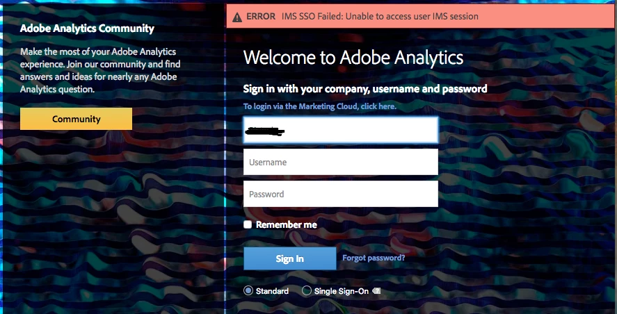 I frequently face the error message “ERROR IMS SSO Failed: Unable to access user IMS session” when access Analytics via Marketing Cloud. So far, the only workaround I have found is to remove adobe cookies or open a new browser window in Incognito mode before signing in to Marketing Cloud.