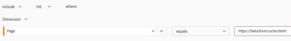 3. But when I add a segment to only see the Form Name from "https://beta.form.ca/en.html", the data are gone. Note that I am using the `Page` dimension as that is where the URL values are being recorded, and I don't have the `Page URL` dimension.