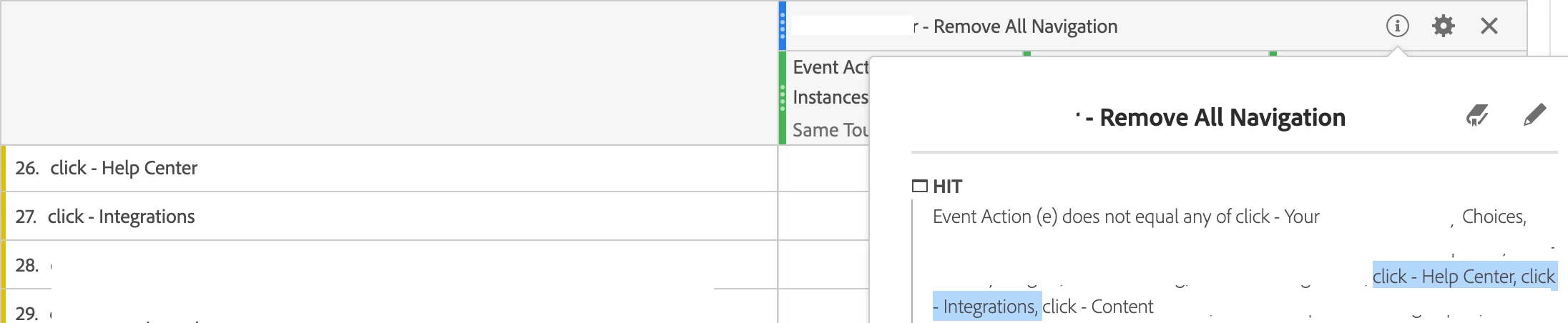 event actions (e) does not equal to click - Help Center, click - Integrations, click - abc, click - def