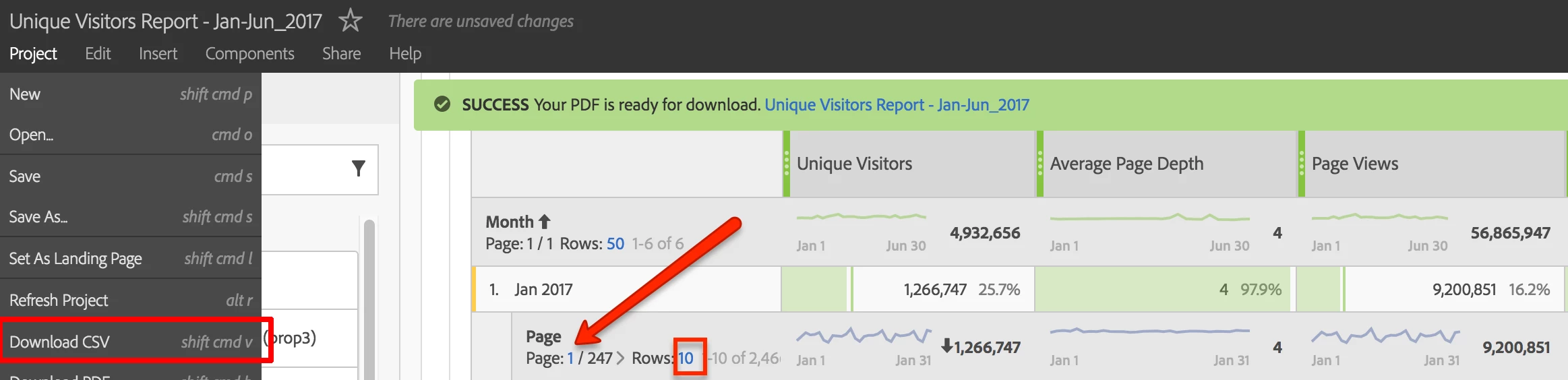 Is it possible to download all the Data (CSV/PDF) format in Workspace? I am only seeing the first 10 rows on the first page of each report. Please see screenshot below.