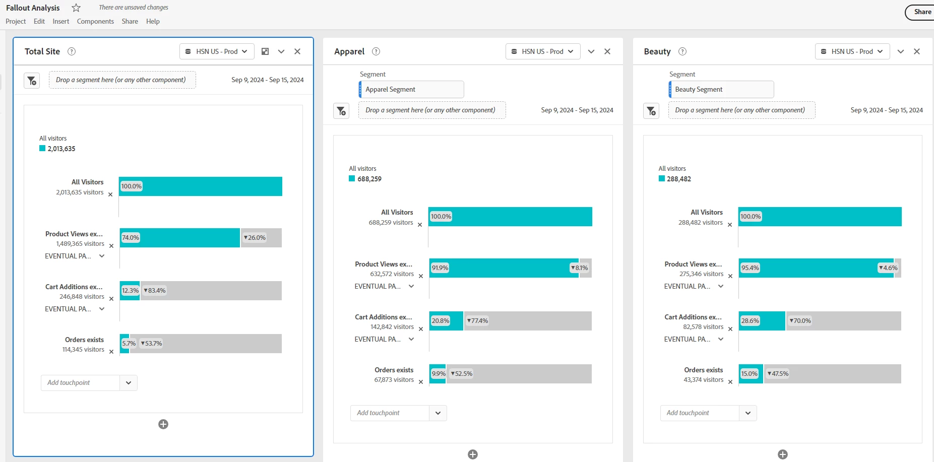 I'm trying to see visitor fallout rates over the following actions, according to shopping category. (Beauty, Jewelry, Electronics, etc.)