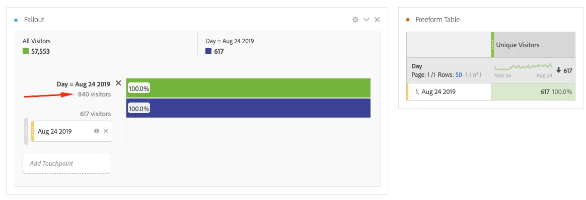 Can anyone explain why the Fallout below shows different number of visitors for a given Day, how is it possible that one of the numbers is higher than the number shown in the freeform table?