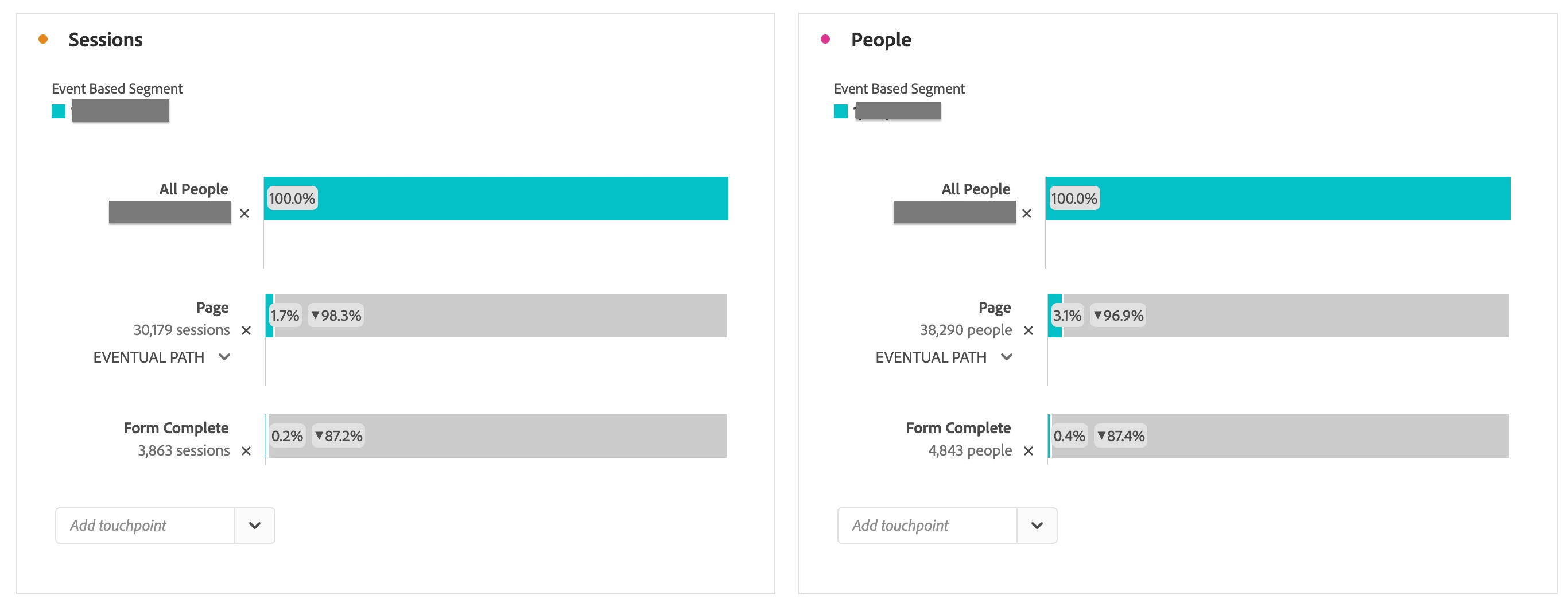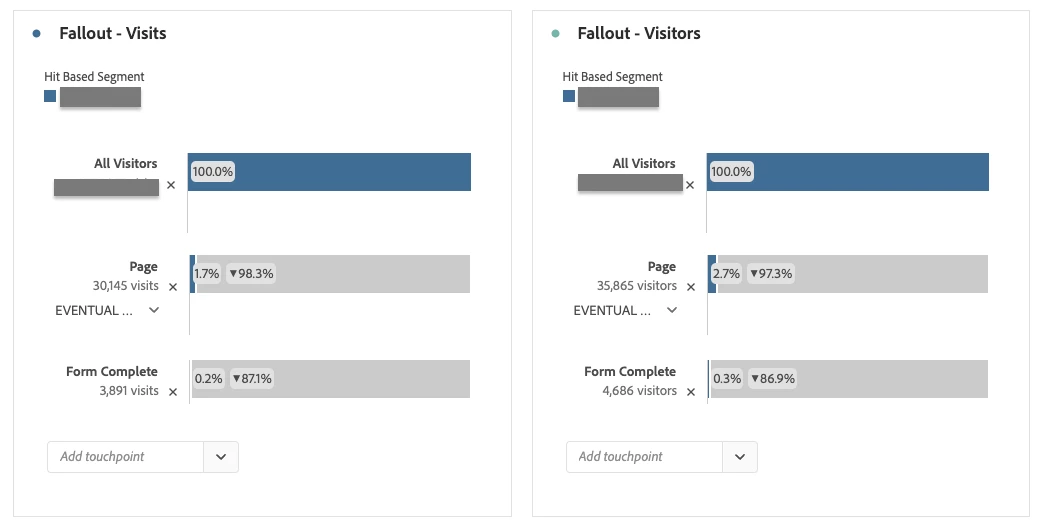 I am trying to track form completions that stem from certain pages on our site. I have a created a couple of fallout visuals but am confused by what I am seeing. When the fallout is changed to look at visits there are actually less form completion hits than there are when it is set to visits. I know there are instances when there can be more than one unique visitor per visit, but when I create these same visuals in CJA with people vs sessions, it is showing the same thing?