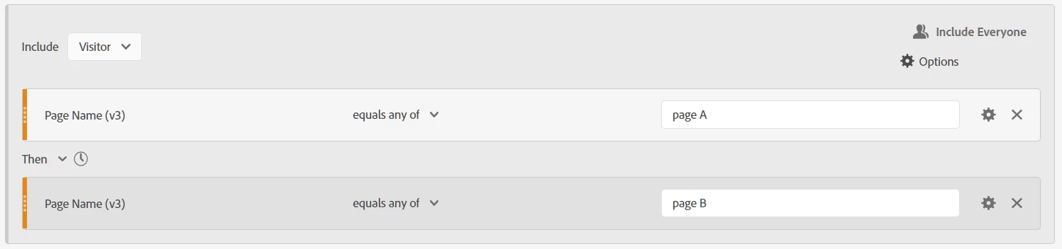 Notice the "THEN" operator. So AA is actually using sequential segments for its fallout visualisation, which implies that it's only reporting on visitors who were at page A and then went on to page B.