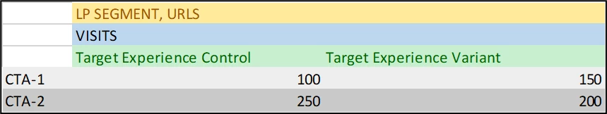 In workspace, when I set up the reporting I build a report with the A/B experiences as columns (green in screenshot) and on the left (rows) the elements that are being tracked via the Activity-Map (clicks in this case). I add Visits (blue in screenshot) for the metric and a URL Segment of URL's for filtering (which matches the LP Promotion URL's that are already defined in the Experience).