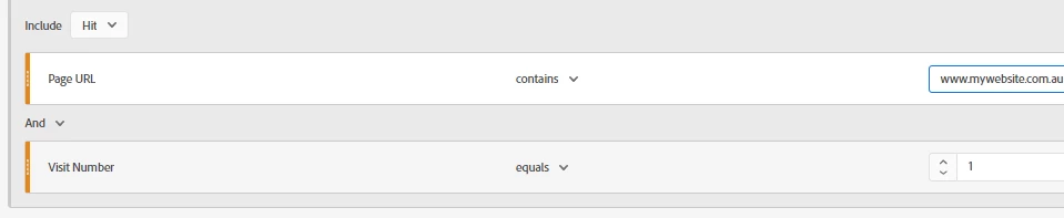 2) Repeat visitors: HIT containing the URL of my webpage AND Visit Number is greater than 1