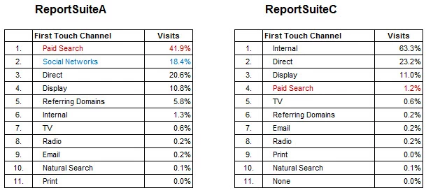 ReportSuiteA is for our landing pages and shows 42% for Paid Search and 18% for Social Networks.