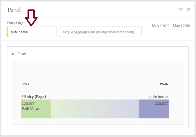 The flow visualization is really great, especially how it will let you see entry and exit pages. However when you place the page dimension on Entry, you see the top entry pages by traffic volume. If I want to see a specific page that isn't in the top five, I've added an Entry Page as a segment filter to see it (red arrow below):