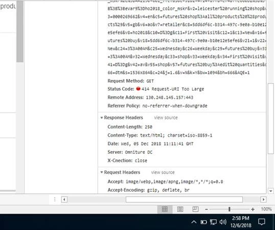 We have scenario in B2B retailer web sites where we can add more than 100 to 200 products to the cart at the same time to place the order. We are using s.product variable to capture the particular product ID, Quantity and price. Unfortunately, when we add more than 100 products to the cart then we are seeing the status as "414 Request URI Too Large" as shown on the attached screenshot. Could any one assist me to fix this issue and let me know for any other information.