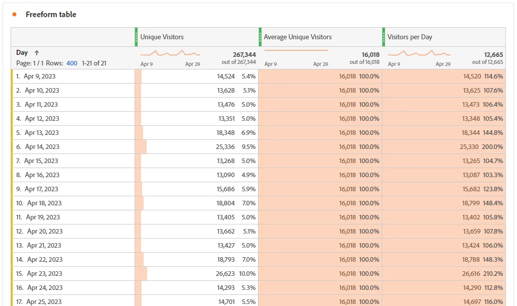 The second is dividing unique visitors by a count distinct of days and it works by diving the deduplicated total by the number of days. The issue with this is that it can give a daily visitor number that is lower than any single day total (because it's likely you'll have customers visiting more than once, especially for longer time periods).