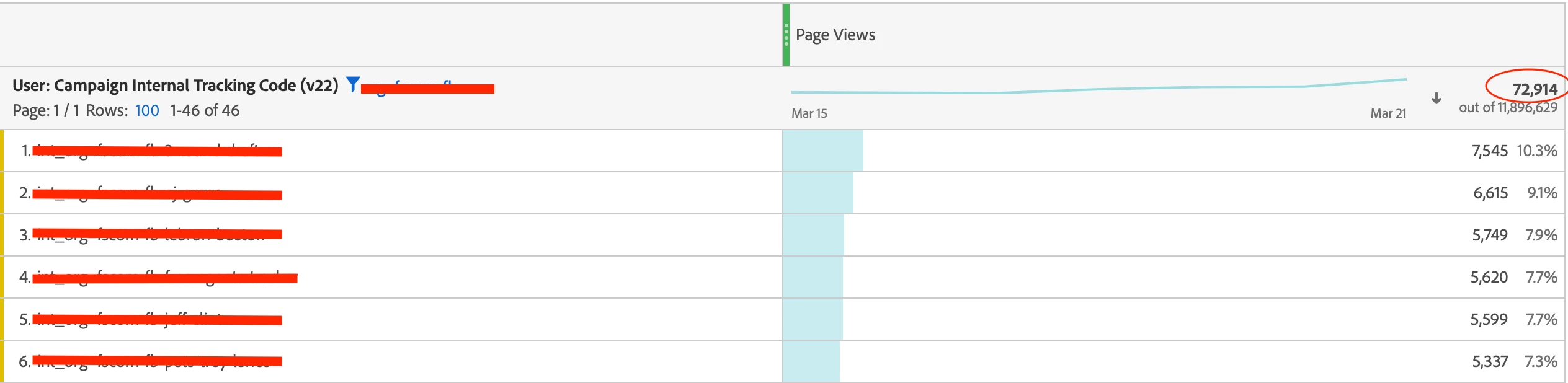 We're using Adobe Analytics to track website views via specific links (links omitted for company privacy). Upon trying to link to Google Data Studio, I selected the option for "Total Page Views" but instead of getting the number circled at the top right (72,914), I'm given the number below it (11,896,629). I know the number below is the grand total, but I'm not sure how to omit that from data studio.