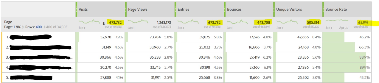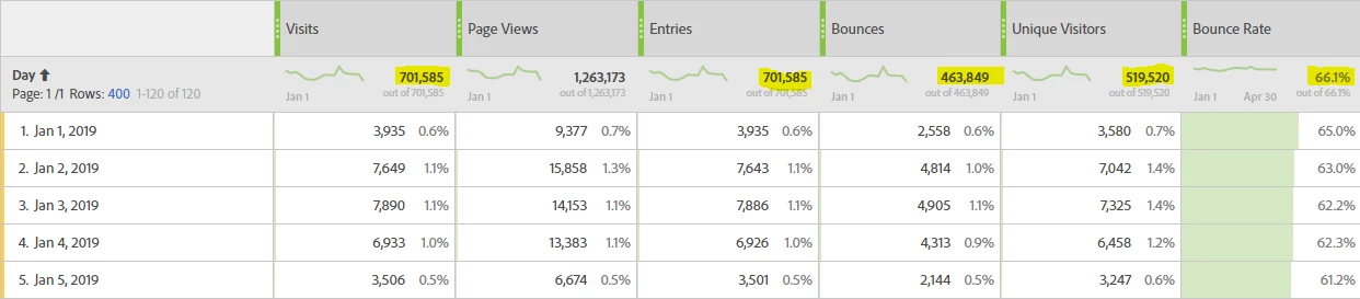 When viewing the "headline metrics" of visits, Entries, Bounces, Bounce Rate and Unique visitors, I noticed that across the same date range there can be a difference in the totals, depending on whether I use the dimension of 'Page' or 'Day'. See images below to see the difference