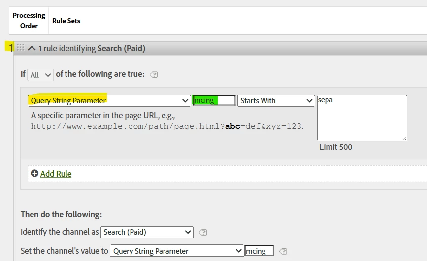 So logic this rule number 1 is to check if an url parameter mcing exists and starts with sepa_