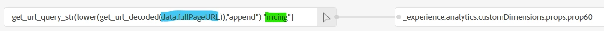 - _experience.analytics.customDimensions.props.prop60 : it will extract the parameter mcing only (thanks to the function get_url_query_str(lower(get_url_decoded(data.fullPageURL)),"append")["mcing"]) and feed the prop60 called Link Tracking