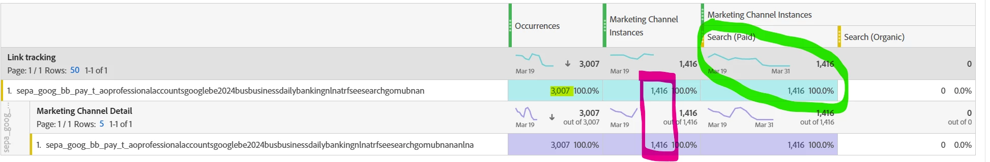Hi @robinl39529461  - the occurrences in yellow include persistence.  But when you filter for just instances (hits where the marketing channel is set vs. where it persisted), you've got a perfect match!  (The delta between the two would be the impact of persistence.)