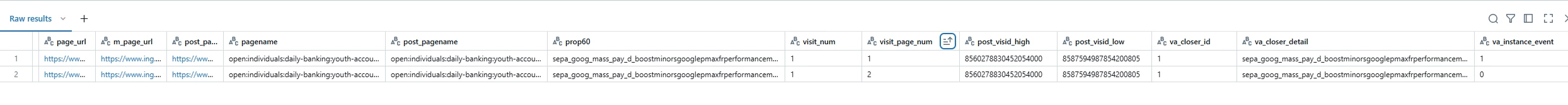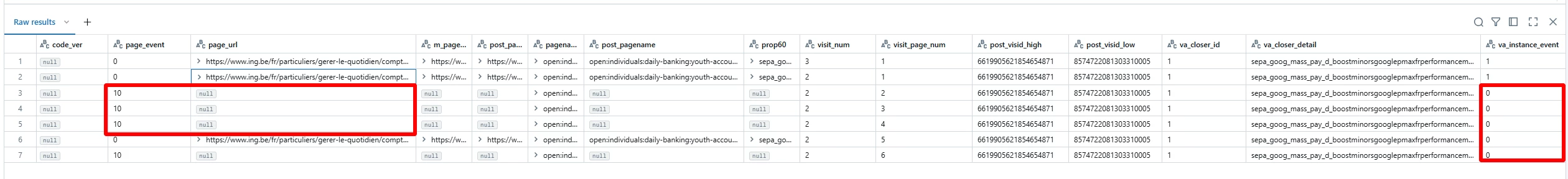 • Notice that in the hit number '5' of the 2nd visit, i.e., the 6th record, the va_closer_id and the va_closer_detail are the same as in 1st hit of 2nd Visit, hence the va_instance_event was not incremented.