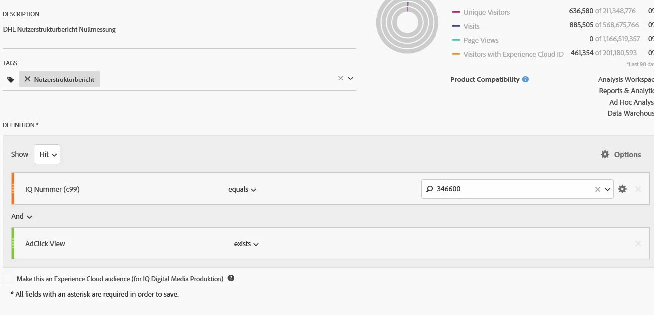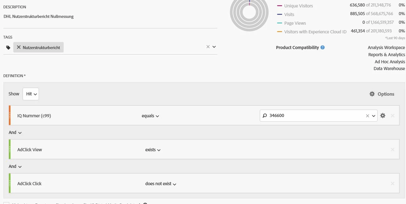 we are currently running an advertising campaign in our portfolio. It runs under a specific IQ number to only track this campaign's ads. Therefore you can see the dimension in the segment. Now we only want to portray the users who saw these ads but did not click. Can you explain to me again, why the following hit segment does not work? As you can see in the second screenshot, I removed AdClick Click and still the numbers on the top right are the same. Can not this be captured in a hit since there are two different server calls? Somehow I do not quite understand the logic behind the hit Segment and these two events "AdClick Click" and "AdClick View".