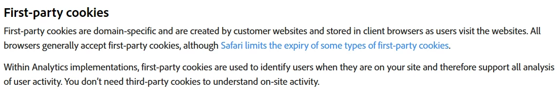 According to this documentation, Adobe’s first-party cookies are limited to a 7-day expiry or, for click-throughs that Apple determines are coming from trackers, a 24-hour expiry. With a 7-day expiry, if a user visits your site and returns within seven days, then the cookie’s expiration date is extended by another seven days. However, if a user visits your site and returns in eight days, then they are treated as a new user on the second visit.