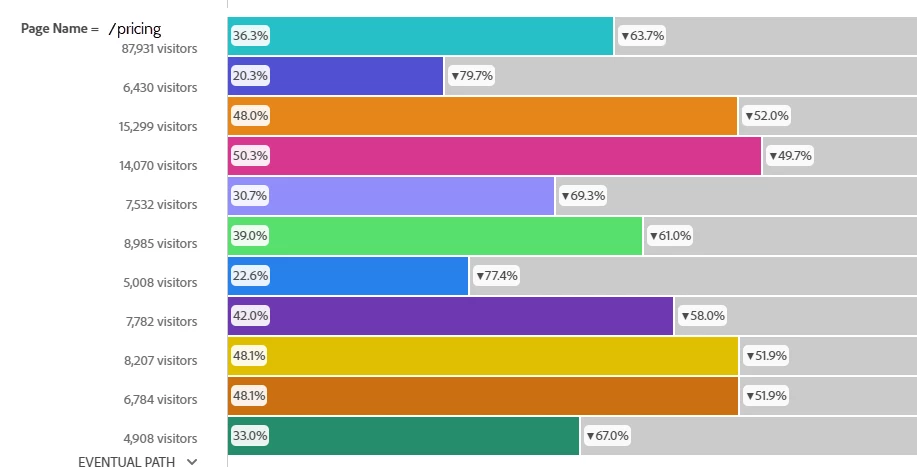 Building a free form table doesn't work because it's not using the logic of eventual path so the table has a higher visitor counts. If I could get the count of unique visitors by page name as eventual path then I could calculate the percentages myself.
