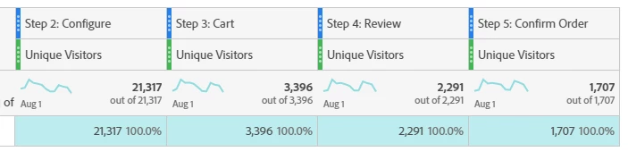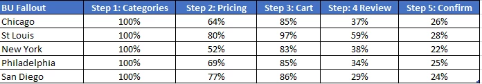 The ultimate goal here is to show a table of 200 geographic business units with their fallout % at each step of the purchase process so we can look for anomalies. In a fallout chart I can add the business units and show the comparison in the chart but more than 10 at a time is too much.