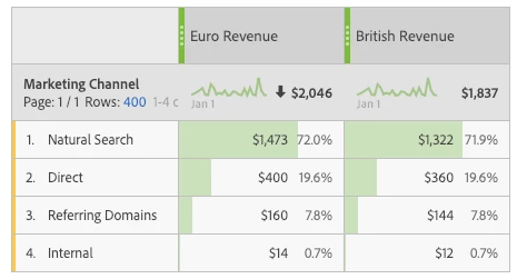 * You'll also notice that the currency symbol is shown based on the report suite's Base Currency setup. That's why these two metrics show a USD $ rather than a Euro or GBP symbol.