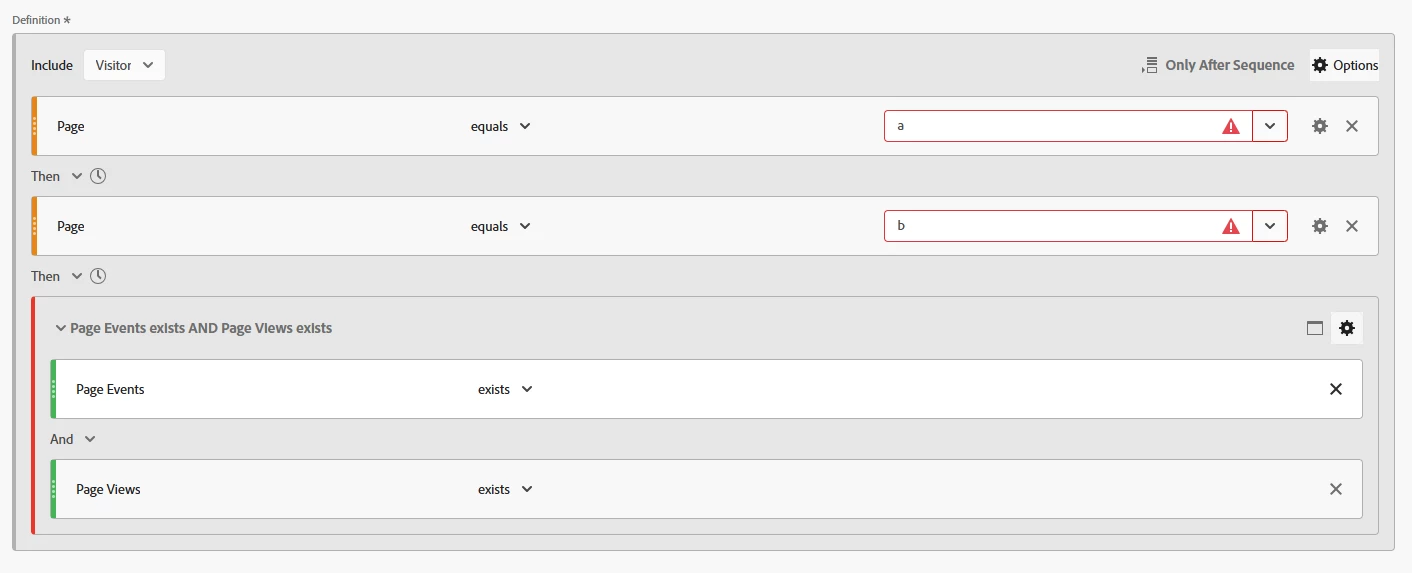 Well, first, your VISITOR segment is returning all data for the users that in the reporting period saw page A then B (this includes visits before and after this sequence.. the sequence may not even be in the same visit... they may have seen Page A on Feb 1 and Page B on Feb 26, and all page views, from all visits, for the matching visitor will appear in your report).