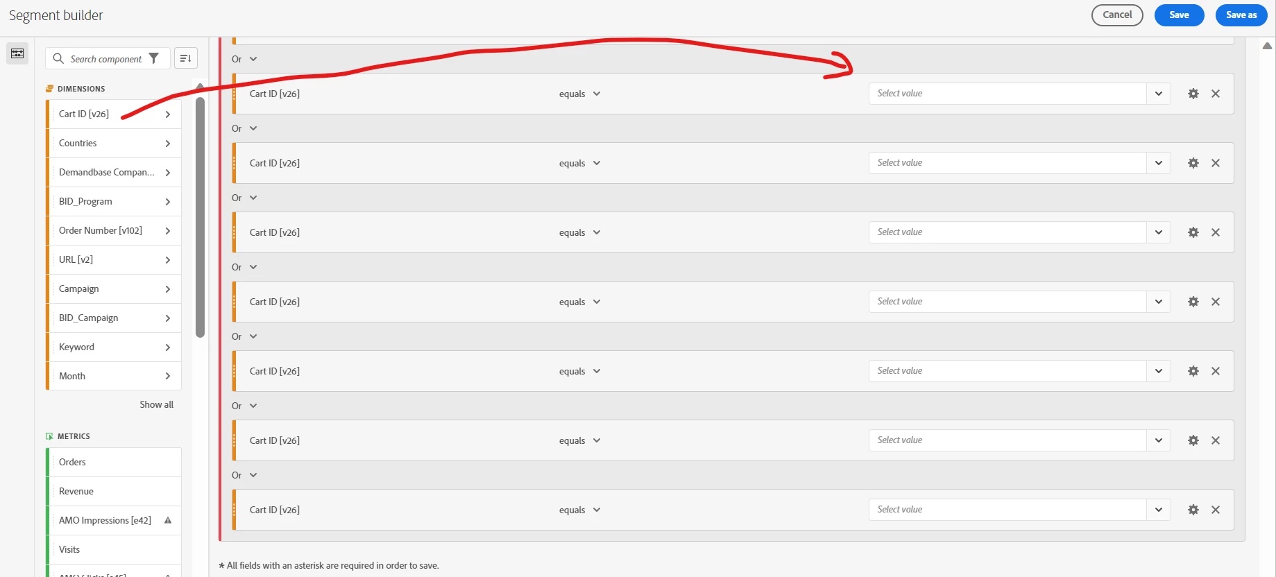 Here's how I do it: manually drag and drop "Cart ID" from the Dimensions lists one by one into the Segment. And then populate it with the Cart ID numbers we want to exclude. Attached is a "screenshot" of how it looks inside. As you can see, it's a pretty time-consuming task. Sometimes, we have to exclude more than 50 cart IDs in a single day, so we have to drag and drop the "Cart ID" from the Dimensions list into the Segment one by one which can get quite overwhelming.