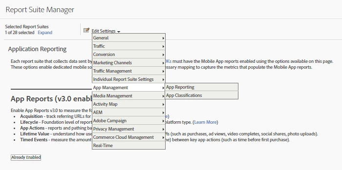 I checked the following site (https://docs.adobe.com/content/help/en/analytics/admin/admin-tools/mobile-management.html)to enable the lifecycle; however, I could not find mobile management > Mobile Reporting.