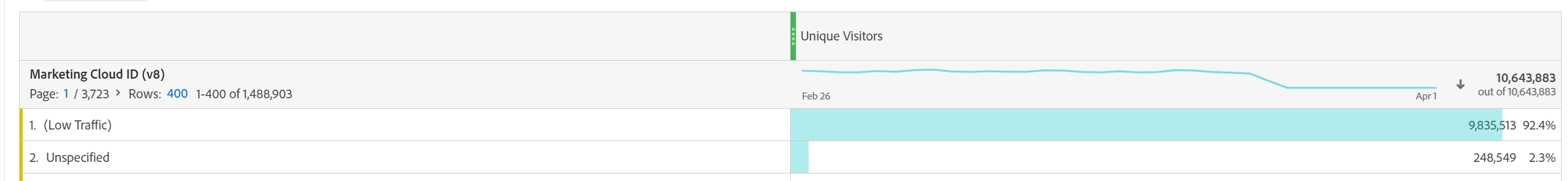 When checking on adobe workspace, I only see marketing cloud ID available, but this is not exactly the same as unique visitors: some visitors doesn't have a marketing cloud ID, and most of users are grouped into 'low traffic'.