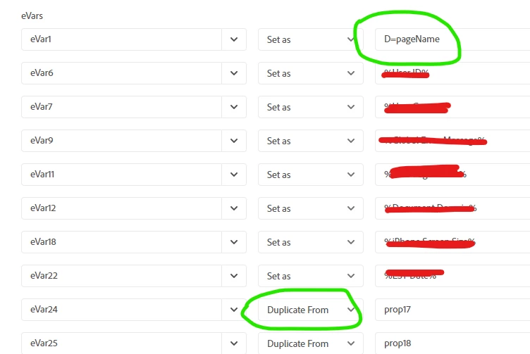 When you select "Duplicate From", the "value" becomes a dropdown menu that is only pre-populated with props and eVars.... so if you want to set a different value here (like pageName, Channel, the current URL, the ECID of the user, etc) you need to use the coding equivalent "D="