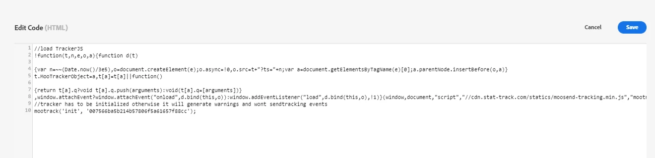 I am trying to implement a code from Moosend (email marketing tool) to track the website, however the steps I took so far made the code visible on the website for the users to see. I am not sure what I am doing wrong, hope you can help me.
