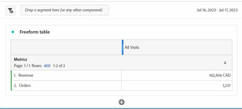 Then I go in the AA workspace and create a free form table. I select Orders and Revenue and I get completely different numbers: 1237 orders for both days. The Revenue, calculated by parsing post_product_list for these orders, is obviously different too from the 162456 CAD in the image below.