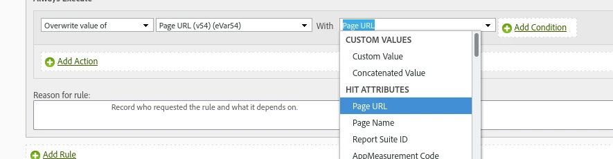Hi @vinay_chauhan that is a nice part about using the Processing Rule I described. You don't have to add the eVar into your front end code. Page URL is automatically sent on every beacon, so you can copy that value into an eVar in a new Processing Rule. Here is an example where an eVar (eVar54) called "Page URL" is populated with the value of "Page URL" under Hit Attributes