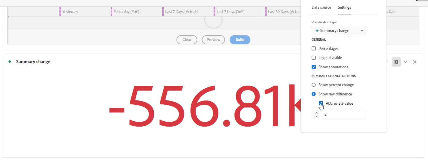 But, if you use the new "Key Metric Summary (which you can't build from a table, but have to add the metrics/segments/etc directly), you can turn off the trend line, and it does show the raw difference in decimal places. You can't turn off the % though, so if you can live with this display, this may be a better option for now... (I would also log an idea to allow for decimal places without abbreviated display to be added to a normal summary change visualization for small numbers)