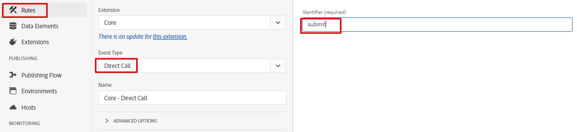 After passing the information. Create a direct call rule and pass the identifier. Identifier should be the same as you passed in the  _satellite.track() which will be ‘submit’ in this case.