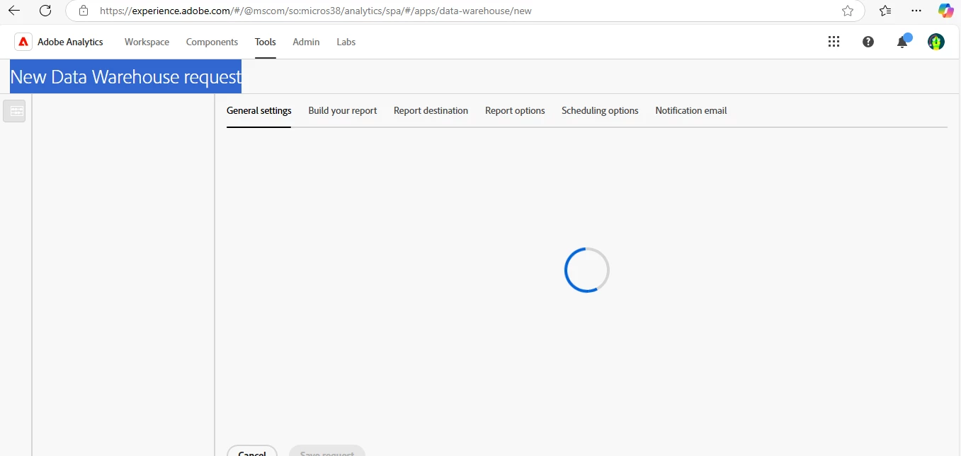 I am trying to create a data warehouse request in Adobe Workspaceto put report in azure storage account, but the page keeps loading.