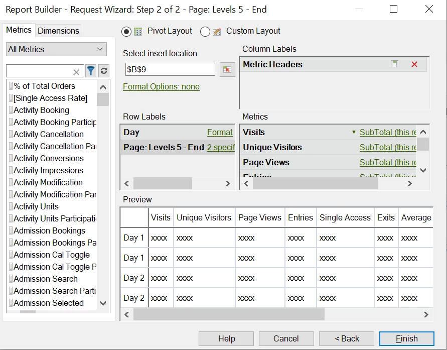 I Want to create a report builder request where the granularity is daily and in the rows i want to have combined data for the 2 specified pages. not in seperate rows for each page