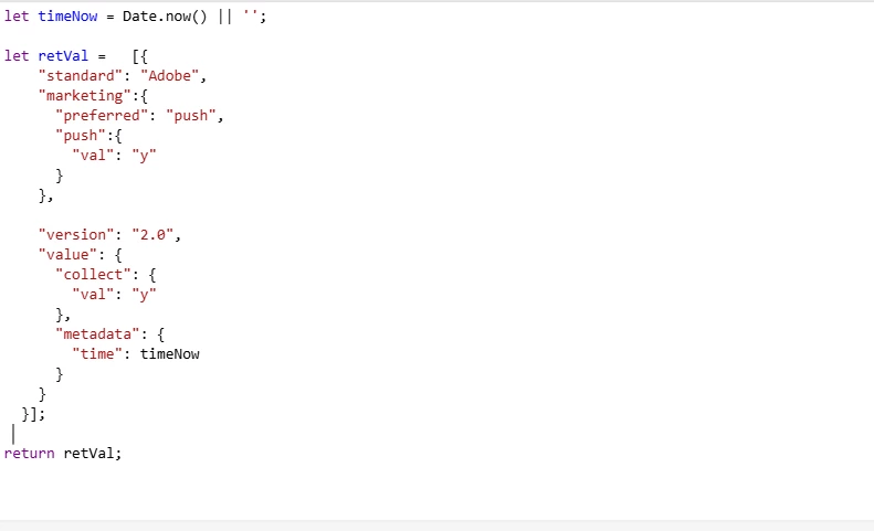 Here’s my setConsent object: [the code below is coming the data element : %Consent Object%]