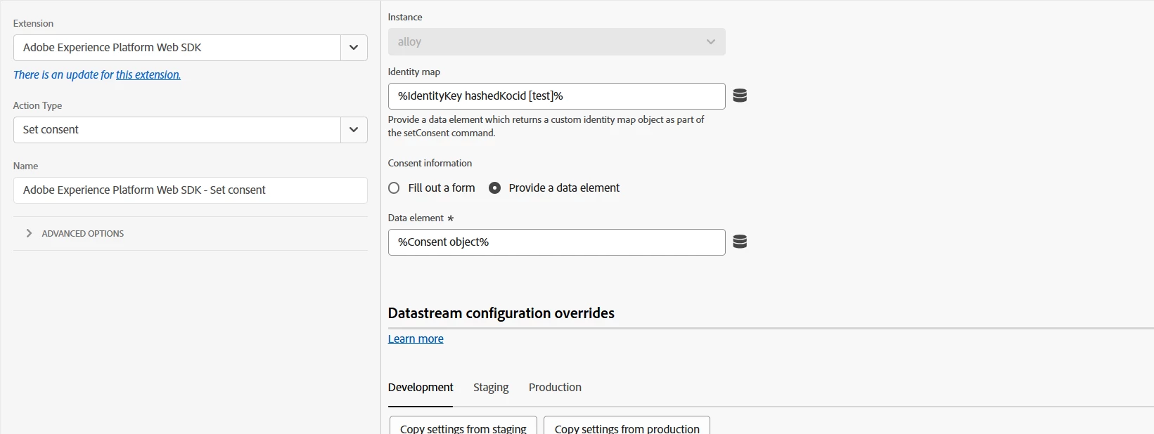 I'm working on sending user consent using the setConsent action type in Adobe Launch. I’m specifically trying to compare the Profile against the ECID generated. While I can see that the consent lands in the Profile, the IdentityMap sent along with setConsent doesn’t appear to be recorded in the Profile, and the stitching between the ECID and the ID in IdentityMap isn’t occurring.